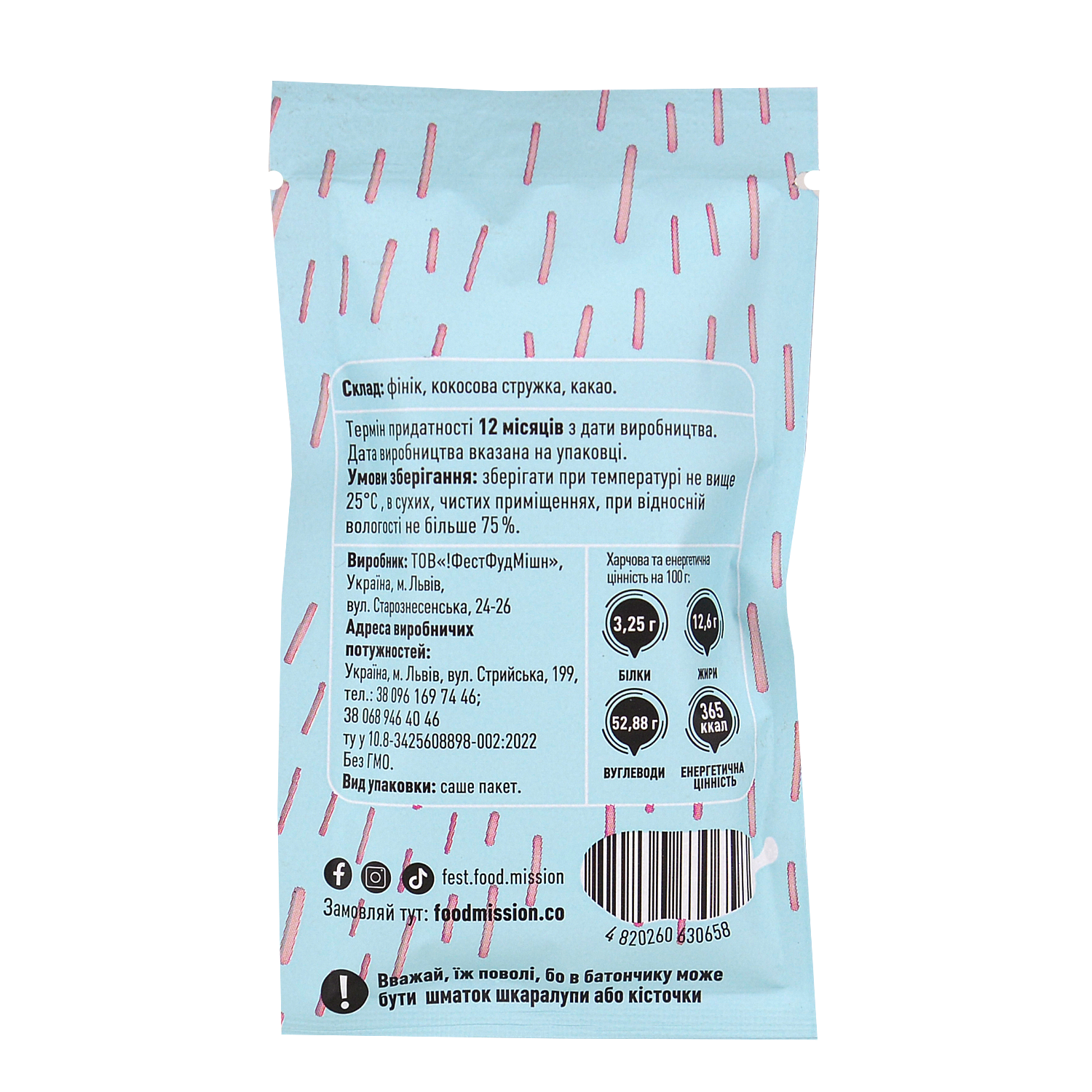 Купить недорого батончик Food Mission Финик-Кокос 40г можно с доставкой по всей Украине, а также посмотреть, забрать или оформить заказ в наших шоурумах в Киеве, Одессе и Ровно.