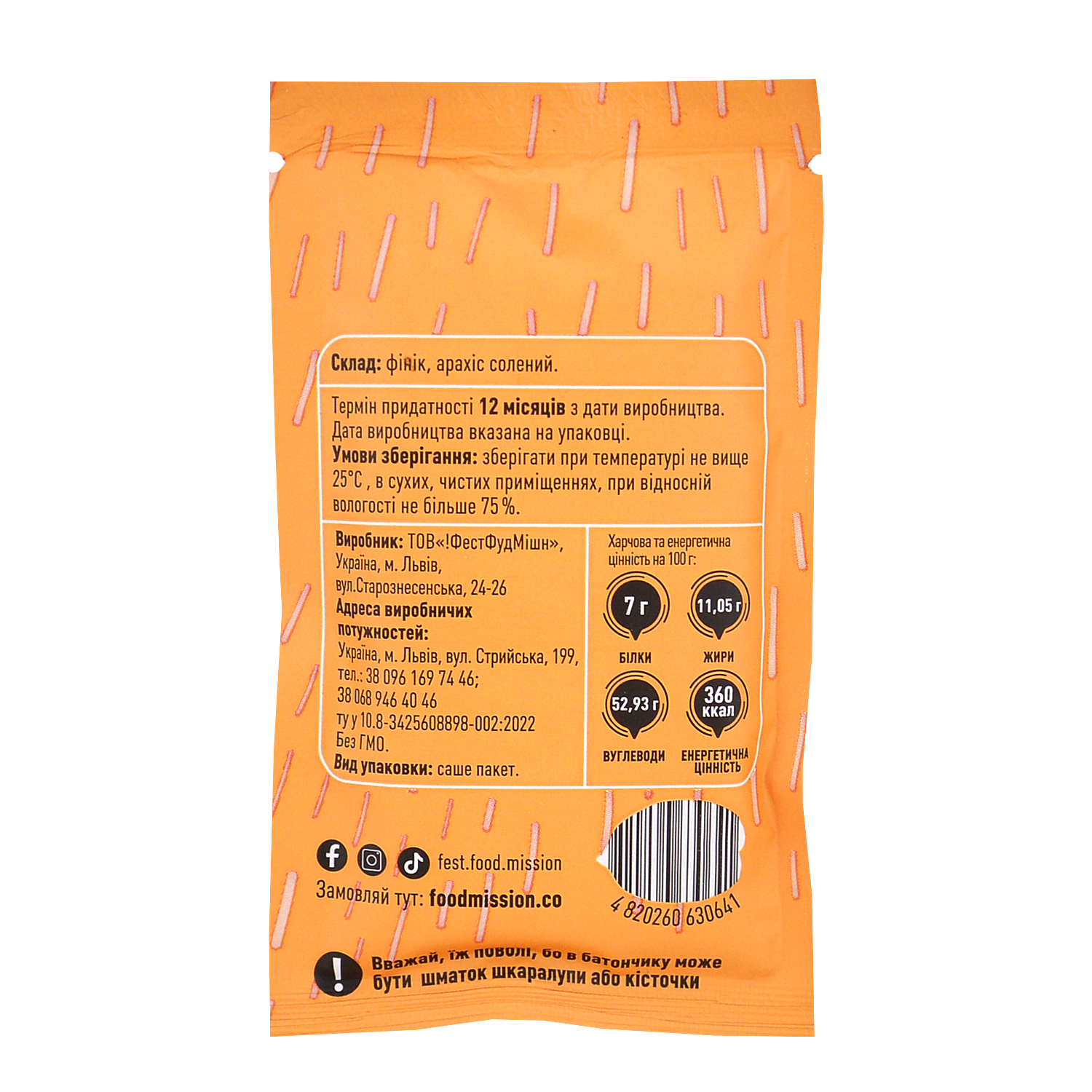 Батончик Food Mission Солёный Арахис сочетает в себе сладость фиников и насыщенность солёного арахиса. Он станет прекрасным спутником в дороге, на работе или после тренировки — когда нужно быстро подкрепиться.