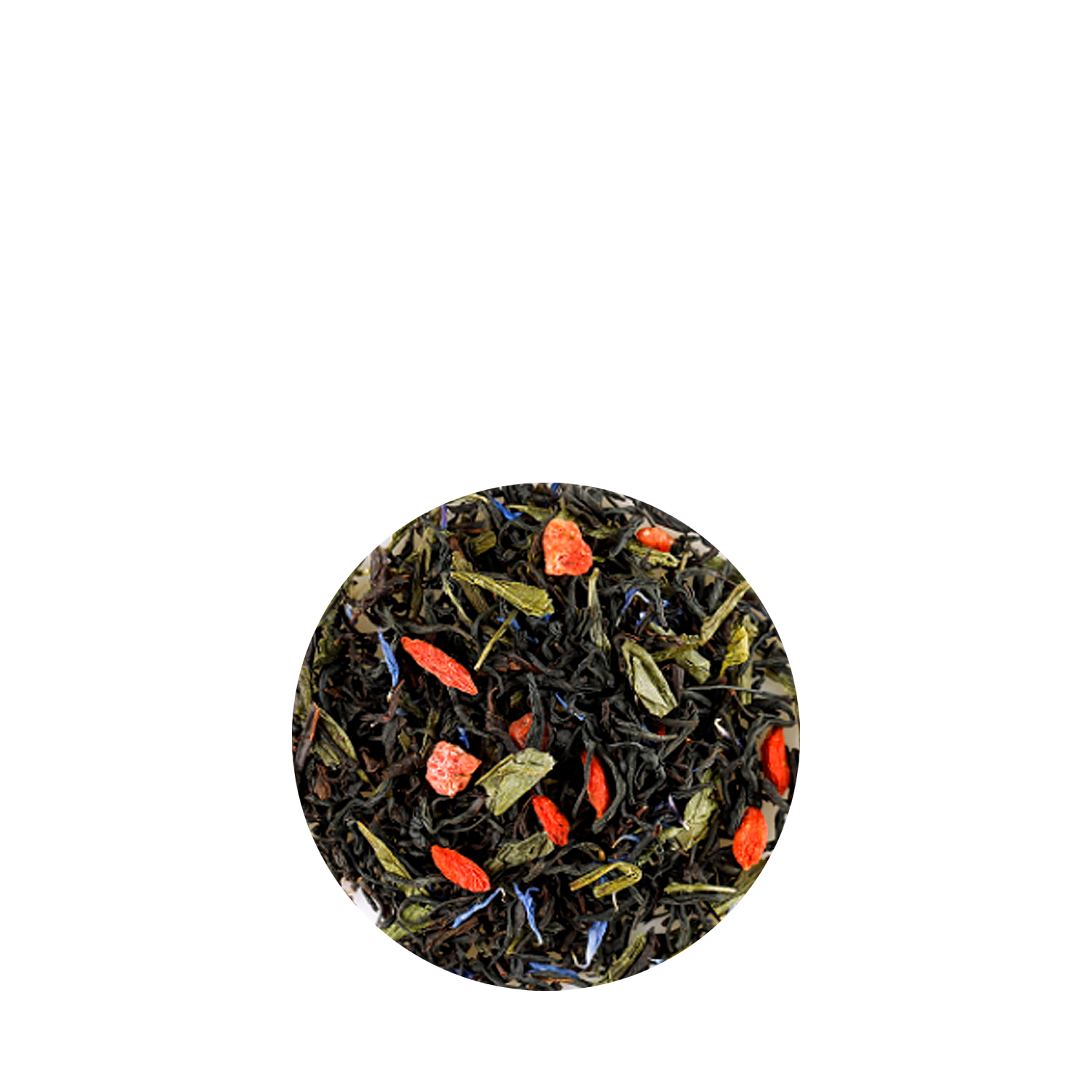 - Состав: смесь чая цейлонского чёрного листового, чая китайского зелёного листового, ягоды годжи, кусочки клубники, лепестки василька, натуральный ароматизатор "Земляника".