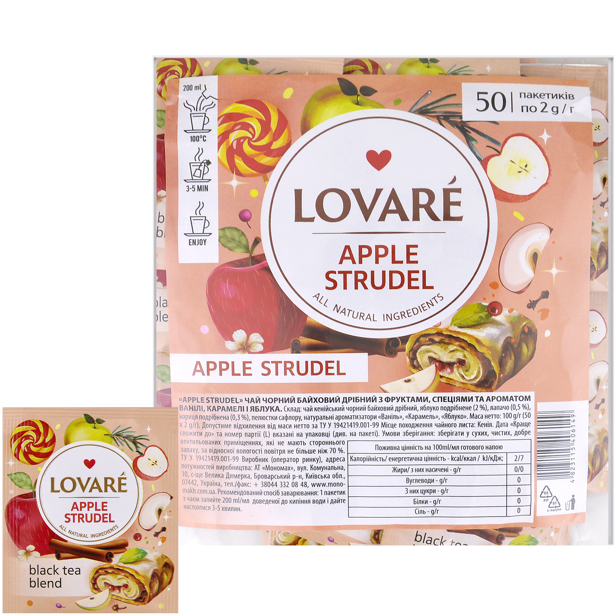 Купить недорого чай чёрный Яблочный штрудель LOVARE 50 шт х 2 г можно с доставкой по всей Украине. Также продукция доступна в наших шоурумах в Киеве, Одессе и Ровно — где вы сможете ознакомиться с ассортиментом и забрать заказ лично.