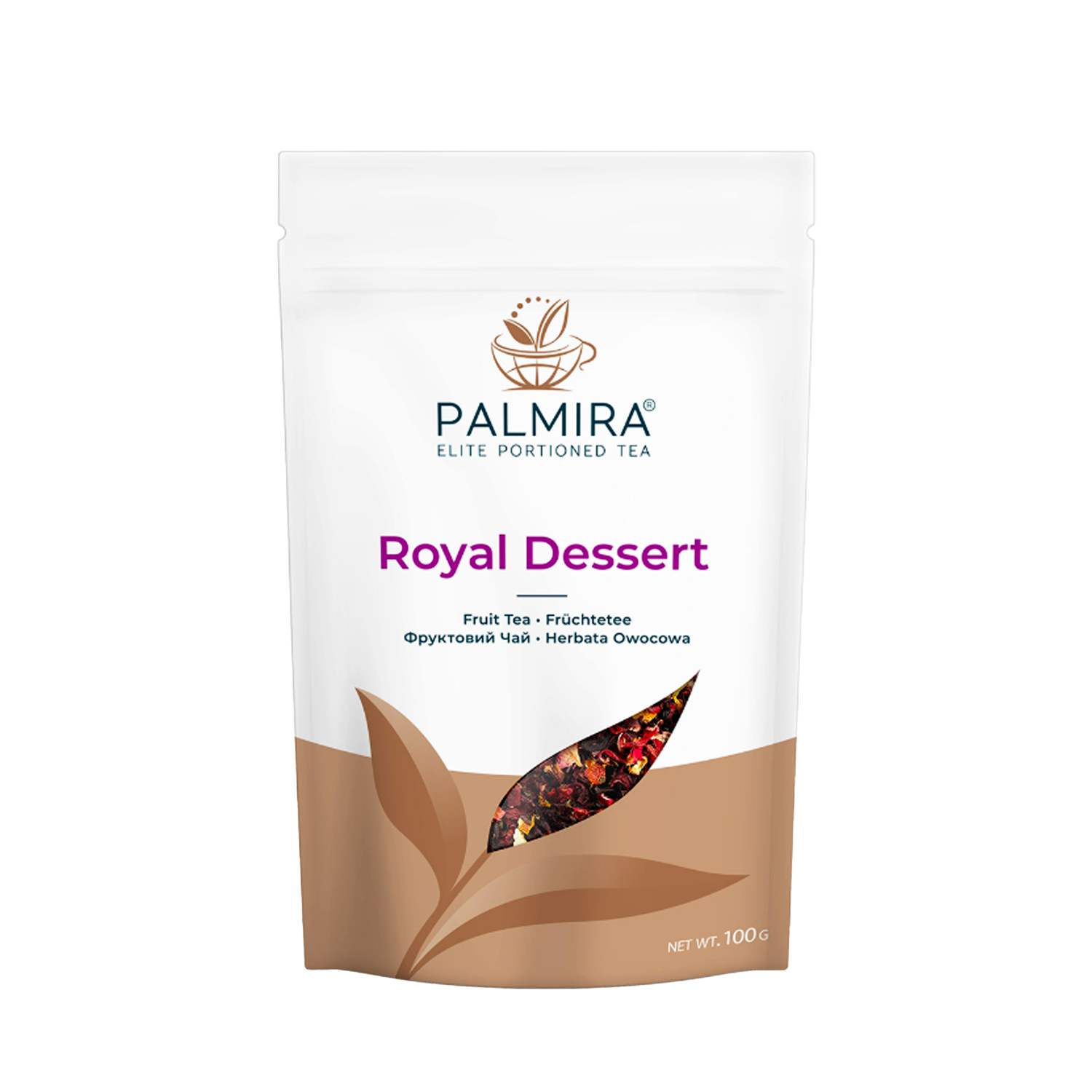 Королевский десерт от PALMIRA - это невероятное сочетание суданской розы "каркаде", спелых вишен, терпковатого шиповника, апельсиновой цедры и пряной корицы. Этот фруктовый чай станет здоровой альтернативой соку. Чай не содержит кофеин, но при этом всё равно хорошо бодрит и наполняет энергией. Он богат витаминами и прочими полезными веществами. Вы можете купить чай фруктовый Королевский десерт PALMIRA 100 г или выбрать другой рассыпной чай.