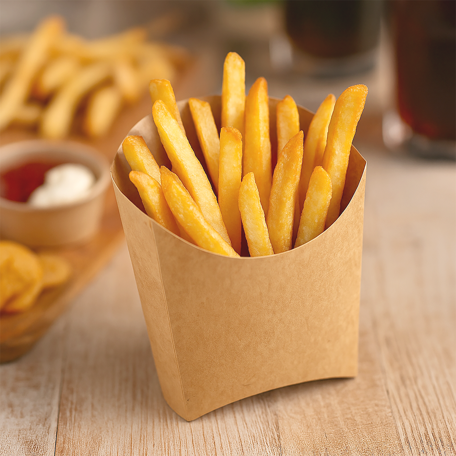 Одноразовая специальная упаковка для картошки фри - это хороший вариант упаковки для заведений быстрого питания. Такая упаковка занимает минимум места при транспортировке и она удобна для подачи в заведении или "на вынос". Открытая форма упаковки избавит вас от необходимости использовать тарелки или какие-либо другие ёмкости для картошки. Упаковку удобно держать в руке, она хорошо сохраняет форму и не обжигает. Упаковка изготавливается из плотной крафтовой бумаги, не впитывает запахи и жиры, не меняет вкусовые качества блюда. Вы можете купить упаковку для картошки фри крафт 120х90х40 мм для фастфудов, кафе, торговых точек, заправок, кейтеринговых служб и т.д. Также вы найдёте у нас другие коробки для еды "на вынос".