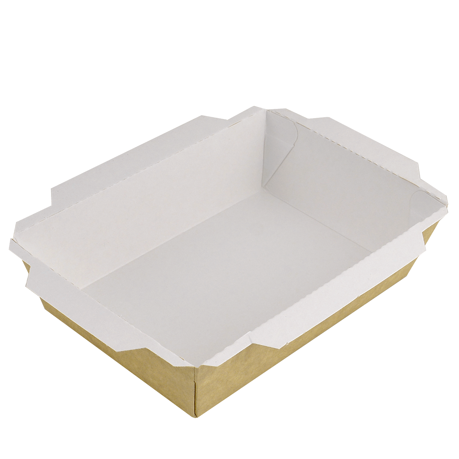 Крафтовый контейнер белого цвета — практичное решение для хранения, доставки и подачи готовых блюд. Благодаря прямоугольной форме его удобно размещать в сумках или коробках для транспортировки. Контейнер изготовлен из прочного крафт-картона с внутренним ламинированным слоем, который обеспечивает устойчивость к влаге, жиру и высоким температурам. Он подходит как для горячих, так и для холодных блюд, не деформируется и сохраняет аккуратный внешний вид.