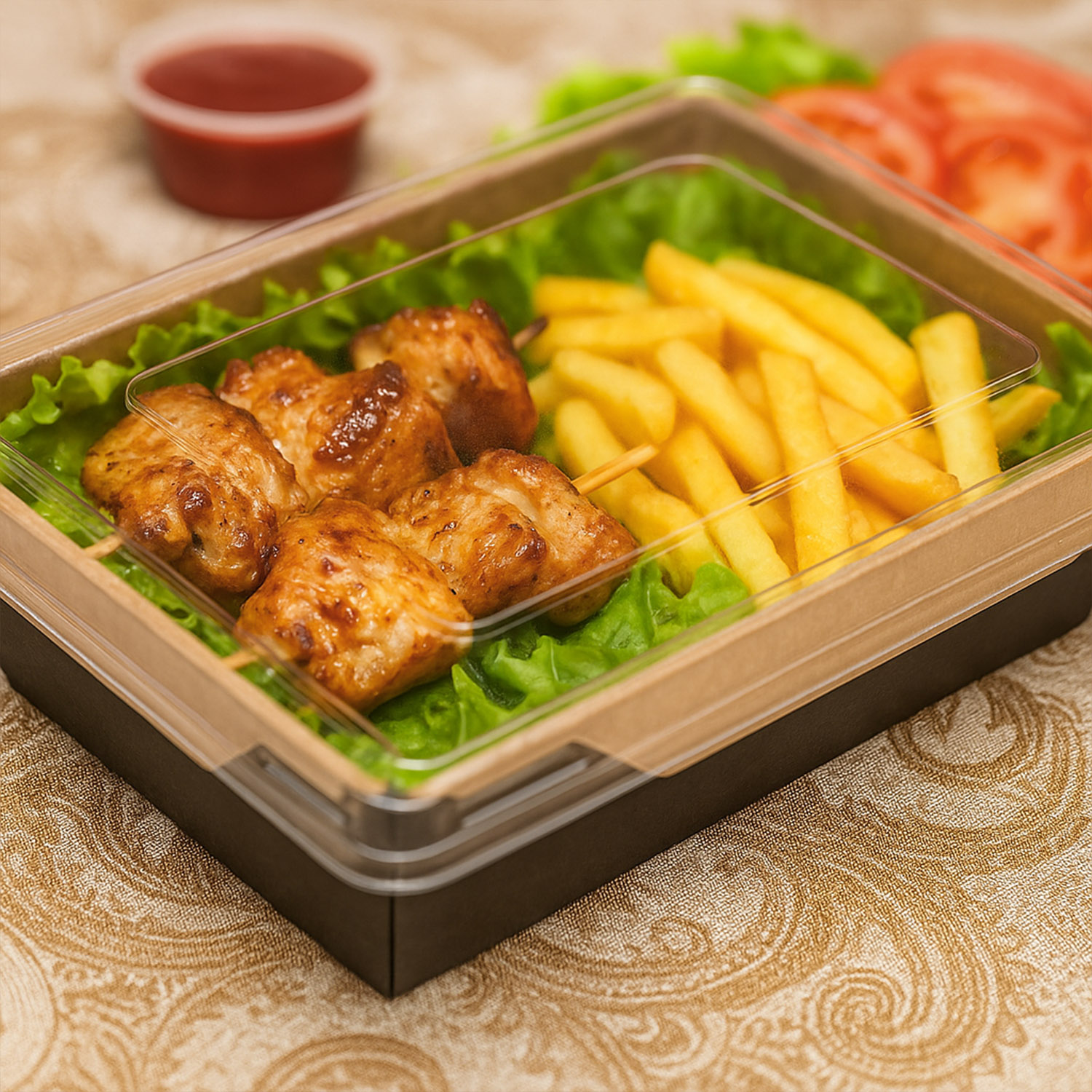 Крафтовый чёрный контейнер — практичное решение для подачи и доставки вторых блюд «на вынос». Он изготовлен из прочного крафт-картона, который не деформируется, не впитывает влагу, жир или посторонние запахи. Такой контейнер сохраняет температуру блюда, обеспечивает удобство транспортировки и аккуратную подачу. Благодаря стильному чёрному цвету упаковка выглядит презентабельно и идеально подходит для заведений, ценящих эстетику сервиса.