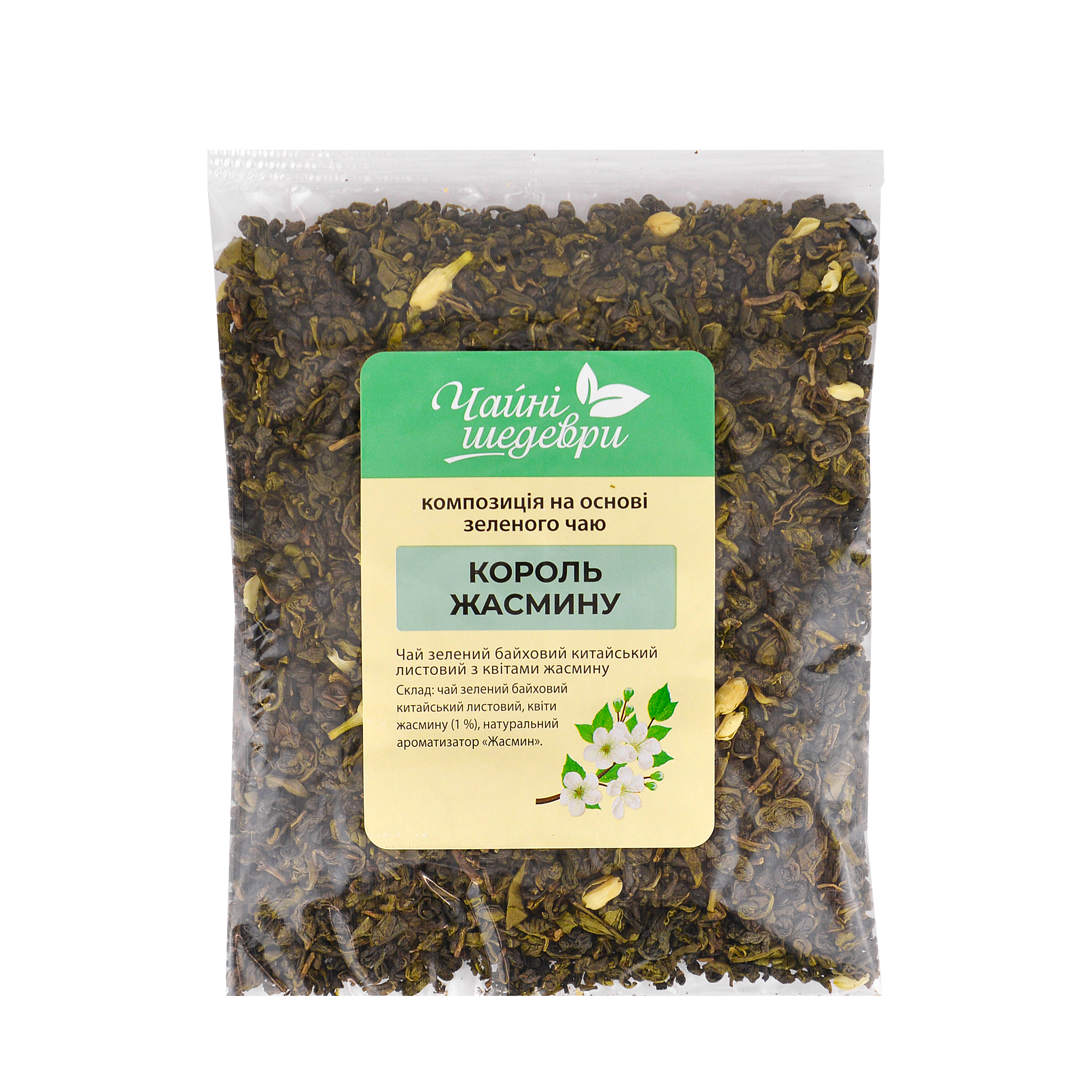 - Состав: чай китайский зелёный байховый листовой, жасмин.