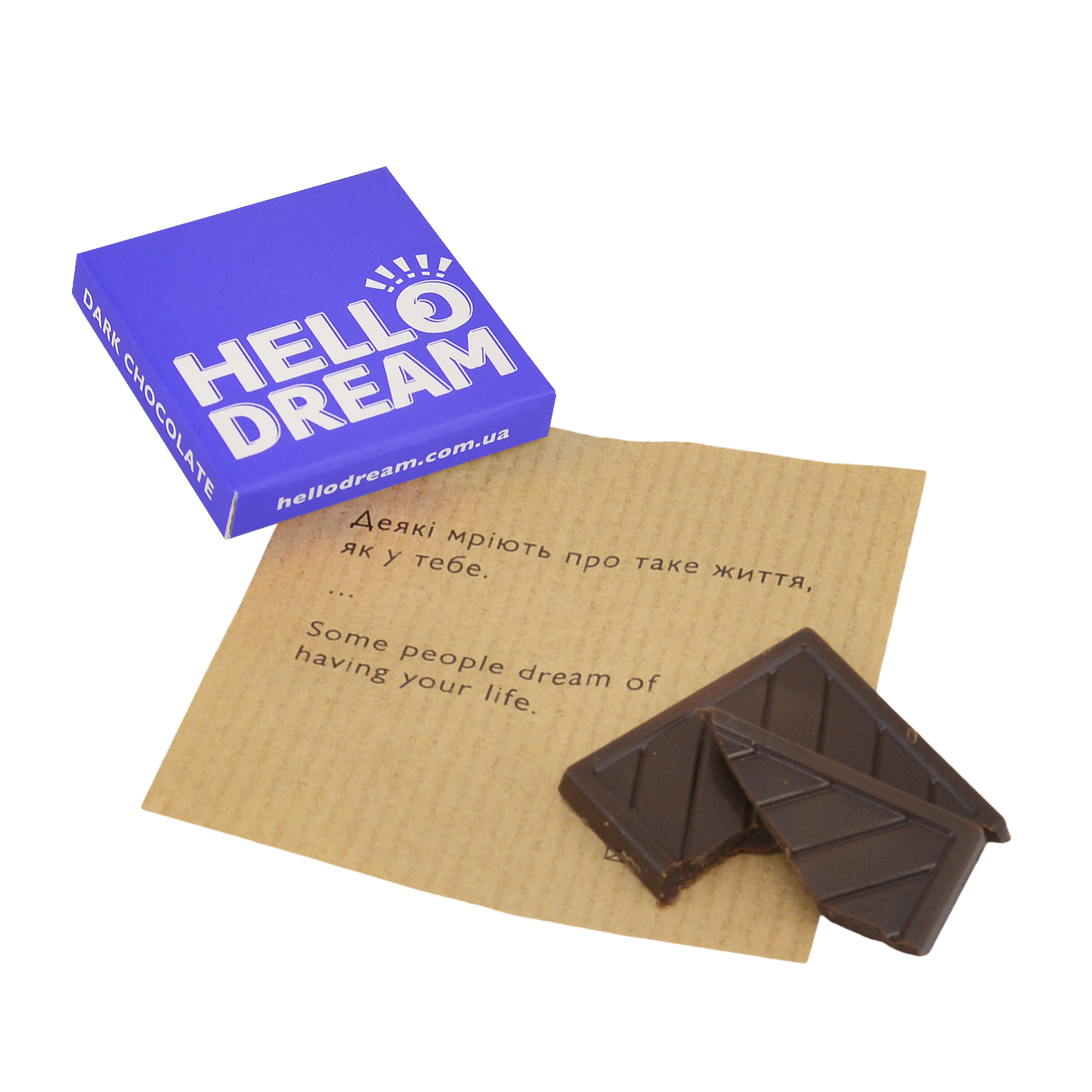 Шоколад Черный с предсказаниями - это настоящий чёрный шоколад в мини-формате с высоким содержанием какао-бобов. Каждая плиточка дополняется креативным и добрым пожеланием-предсказанием, которое дублируется на двух языках - украинском и английском. Существует более 1500 вариаций пожеланий, так что вряд ли вам попадутся одинаковые варианты. Каждое уникальное предсказание удивительным образом попадает точно в цель, это доказано уже многими любителями шоколадок Hello Dream. Миниатюрные шоколадки станут приятным подарком-сюрпризом. Вы можете купить шоколад Черный с предсказаниями для кофеен, магазинов подарков, кафе, ресторанов, кондитерских, интернет-магазинов подарков, служб доставки цветов, на подарок и просто для себя. Также вы найдёте в нашем ассортименте другой шоколад.