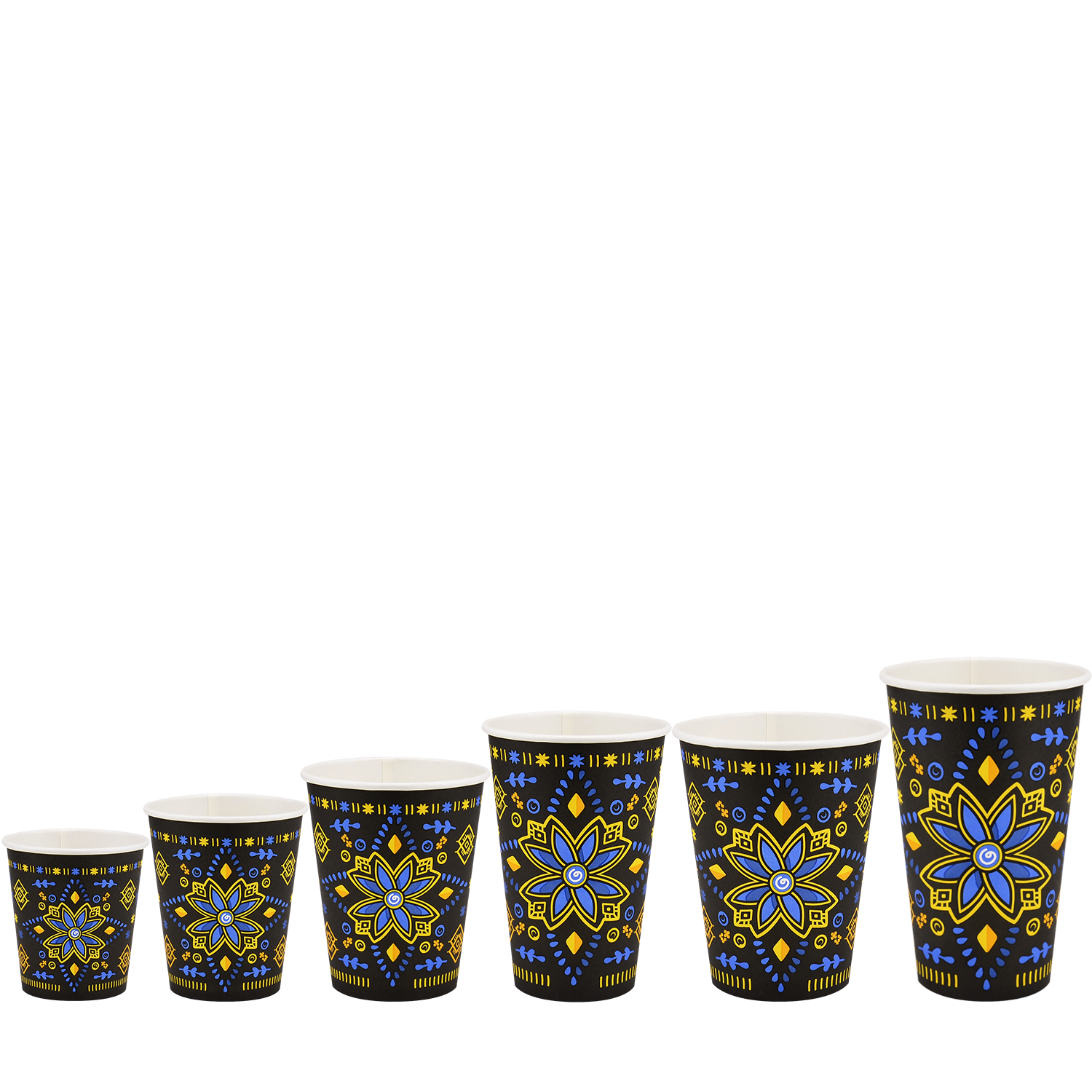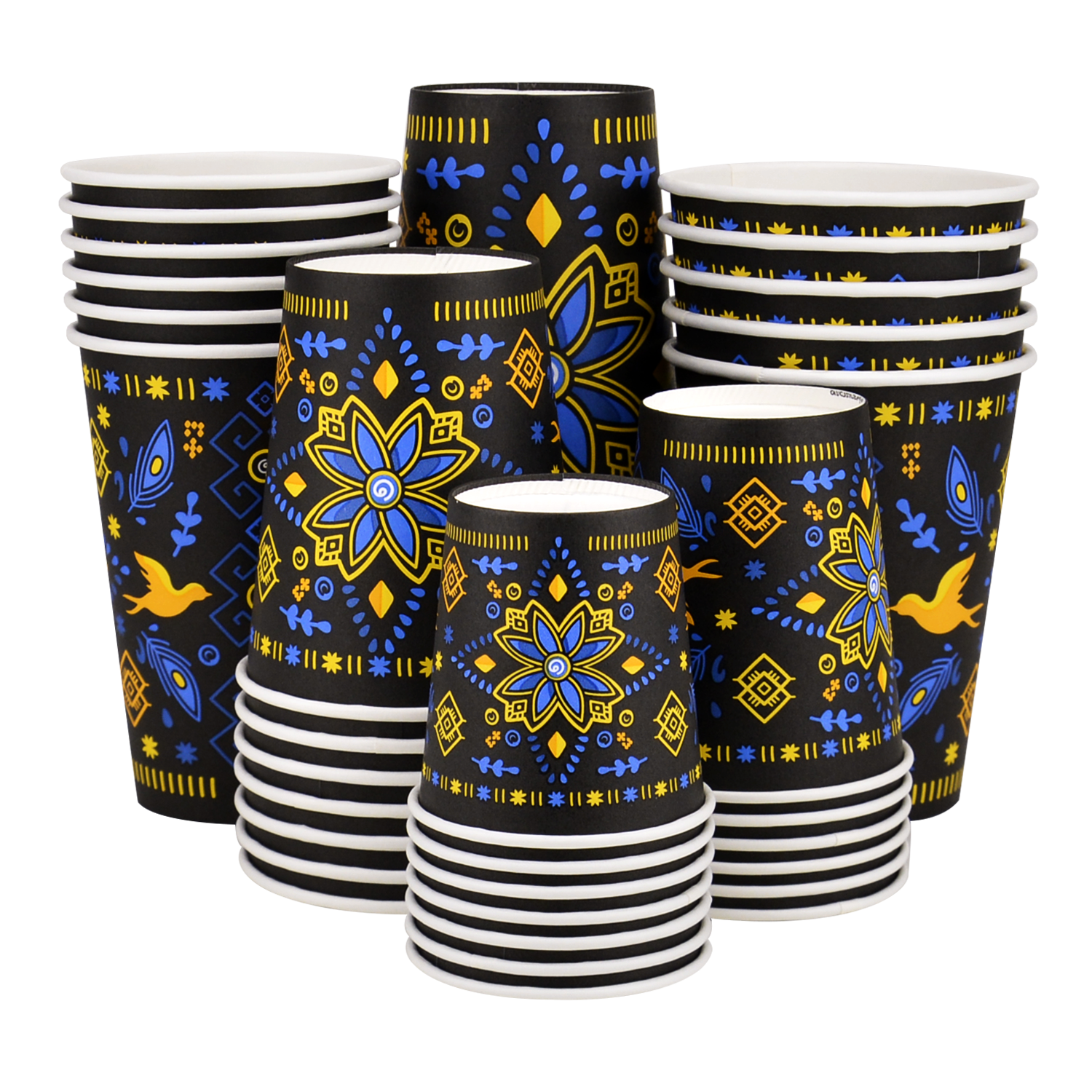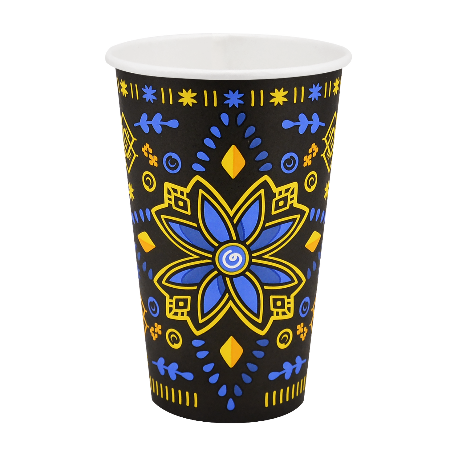 Дизайн бумажных стаканов Стефания был разработан нейросетью. Такая практика впервые была реализована на рынке бумажных стаканчиков. Символика рисунка воплотила в себе богатые ценности украинской культуры. Каждый символ несёт в себе особый смысл для нашего народа. Для любителей больших порций латте, капучино, какао, чая и прочих горячих напитков вы можете купить стакан бумажный 500 мл однослойный Стефания. Если же вам нужны стаканы поменьше, вы также найдёте их на нашем сайте.