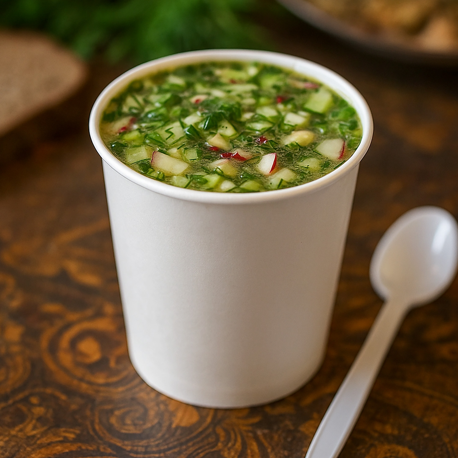 Белый супник объёмом 900 мл — удобное решение для подачи, хранения и транспортировки первых блюд. Он изготовлен из прочного и экологически безопасного крафт-бумаги, которая не выделяет вредных веществ, не впитывает запахи и не влияет на вкус продуктов. Благодаря плотному материалу супник устойчив к влаге и температурам, не деформируется и сохраняет форму даже при наполнении горячими блюдами.
