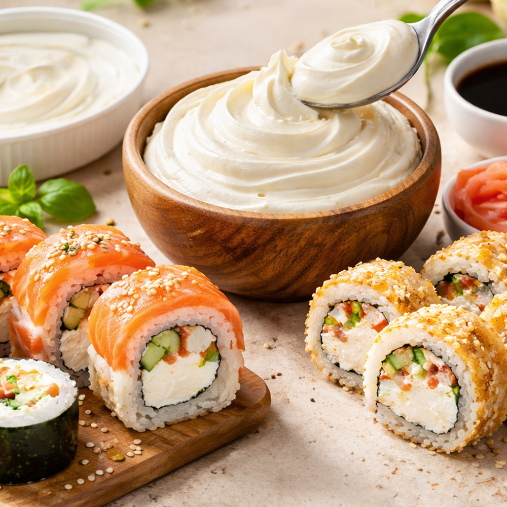 Продукт отлично подходит для приготовления суши и роллов — в качестве кремовой начинки или основы для сочетания с рыбой, морепродуктами и овощами. Он равномерно наносится, не растекается и сохраняет стабильную структуру после формирования роллов, что особенно важно для доставки и продажи навынос.