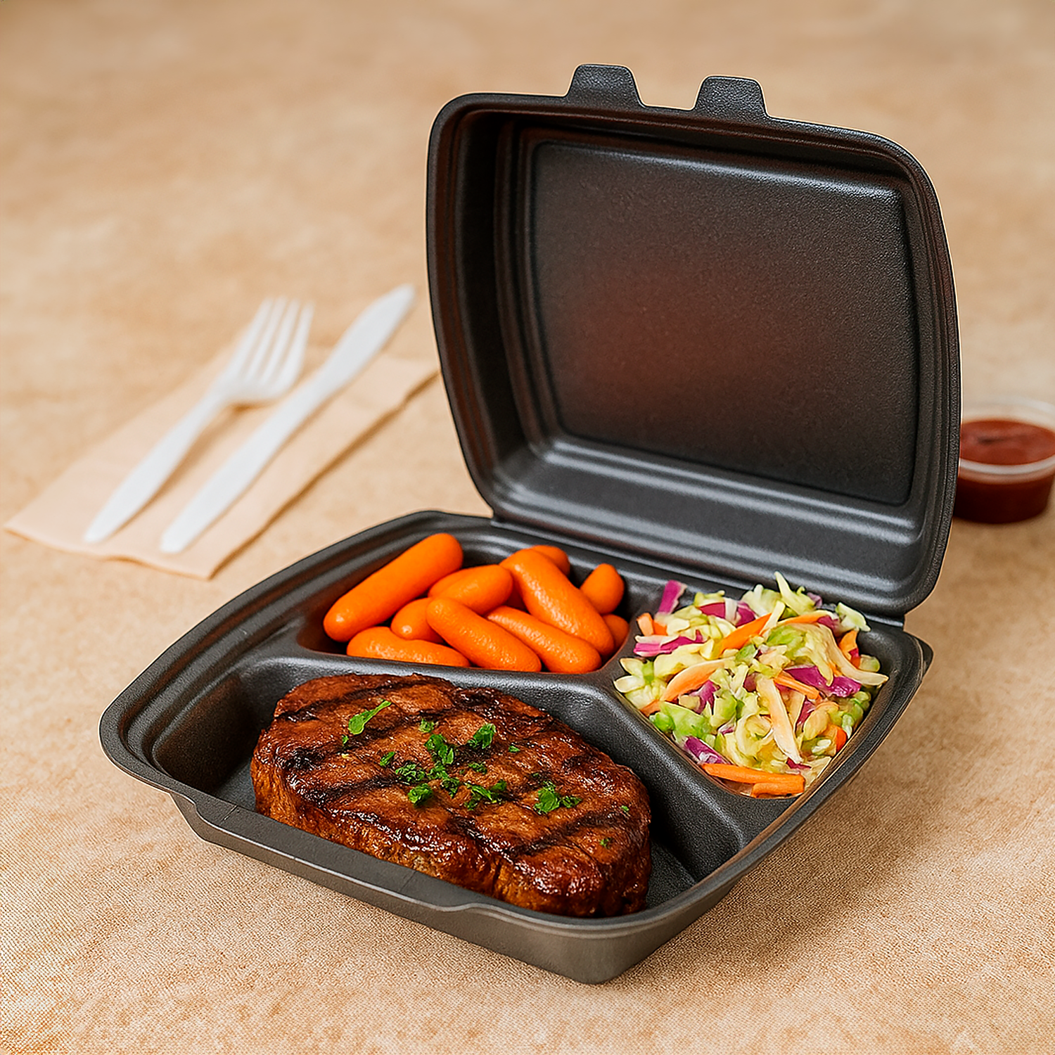 Ланч-бокс - це чудовий варіант для пакування та доставки готових страв. Контейнер виготовляється із спіненого полістиролу та забезпечує надійне транспортування їжі. Завдяки використанню сертифікованого безпечного матеріалу ланч-бокс відрізняється добрими термоізоляційними властивостями. Він може довго зберігати температуру страви. У цьому контейнері можна подавати як гарячі, так і холодні страви. Ланч-бокс розділений перегородками на 3 секції, тому він відмінно підійде для доставки комплексних обідів. Контейнер закривається на клямки, однак, якщо у вашій страві рясна кількість соусу або інших рідких компонентів, рекомендуємо додатково обмотати ланч-бокс харчовою плівкою. Ви можете купити ланч-бокс НР-3 чорний 3 секції 236х197х73 мм для зберігання та транспортування їжі. Розігрівати їжу в контейнері в мікрохвильовці заборонено. Також ви знайдете в нашому асортименті інші ланч-бокси з однією, двома або трьома секціями.