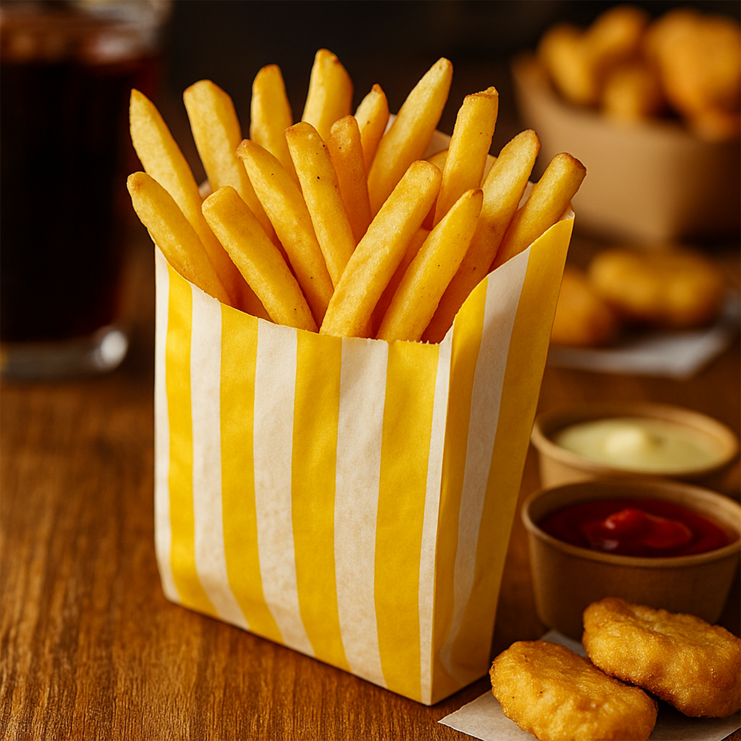 Паперові пакети - це надійний та зручний варіант пакування страв швидкого приготування. Їхньою ключовою перевагою є жиростійкість. Ви можете фасувати в такий пакет їжу, приготовлену в олії, або їжу з великою кількістю соусу. Пакет не протікає і не дозволяє вам забруднитись. Завдяки цій особливості ви можете купити паперовий пакет Жовті смужки 160х120х50 мм практично для будь-якої страви швидкого приготування. Така упаковка забезпечить вам комфорт споживання страви і гарантує надійність її транспортування на доставку. Пакет виготовляється із білого харчового целюлозного крафту з яскравим малюнком у вигляді жовтих вертикальних смуг. Також у нашому асортименті є інші паперові пакети.