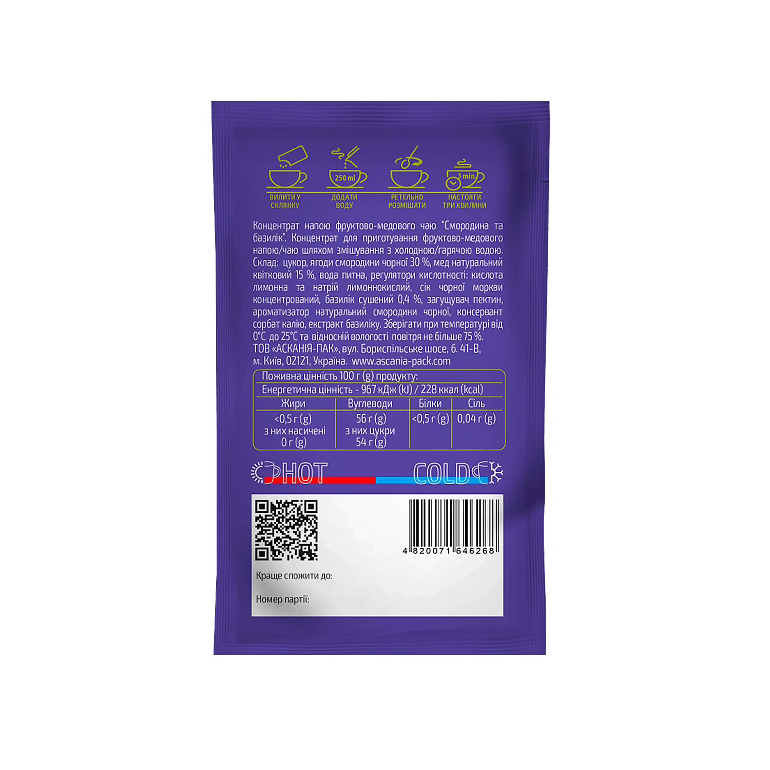 Чай Смородина-базилік від АСКАНІЯ представляє собою концентрований фруктово-медовий напій. Він стимулює захисні сили організму, допомагаючи йому боротися з вірусами та застудою. Напій насичує вас вітамінами, зокрема вітамінами С, А та групи В. Ви можете купити чай АСКАНІЯ концентрат - Смородина-базилік 50 г для приготування як гарячого, так і холодного чаю. Також ми маємо інші смаки концентратів чаю.