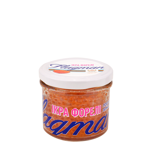 - Склад: ікра форелі — 97%, сіль, олія соняшникова, консерванти: E200, E211