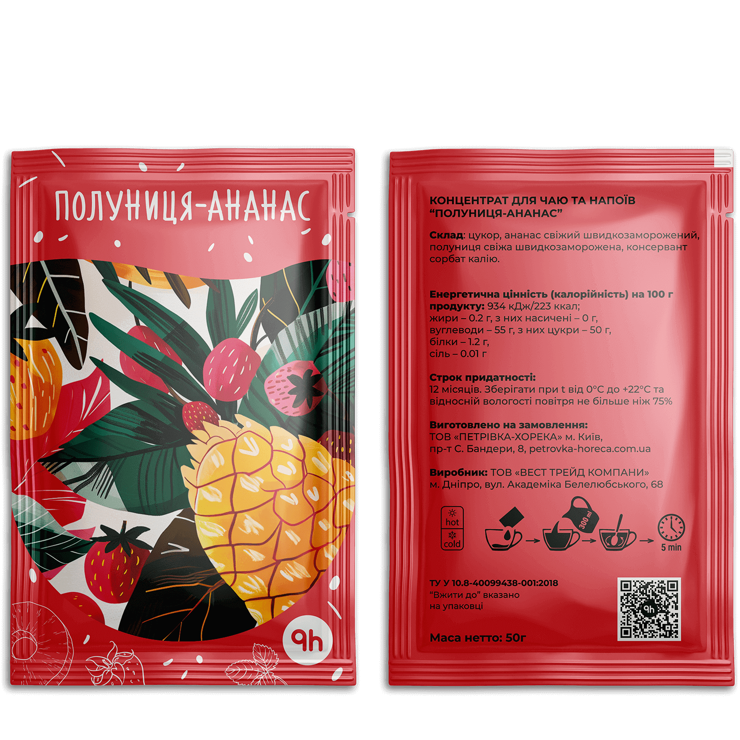 Концентрат Рh HoReCa Полуниця-ананас 50г 10шт - це універсальний фруктовий напій із насиченим смаком, який чудово підходить як для гарячого, так і для холодного споживання. Поєднання соковитого ананаса та кисло-солодкої полуниці створює гармонійний баланс тропічної свіжості та ягідної солодощі. Такий напій прекрасно освіжає в спеку і зігріває в прохолодну погоду.