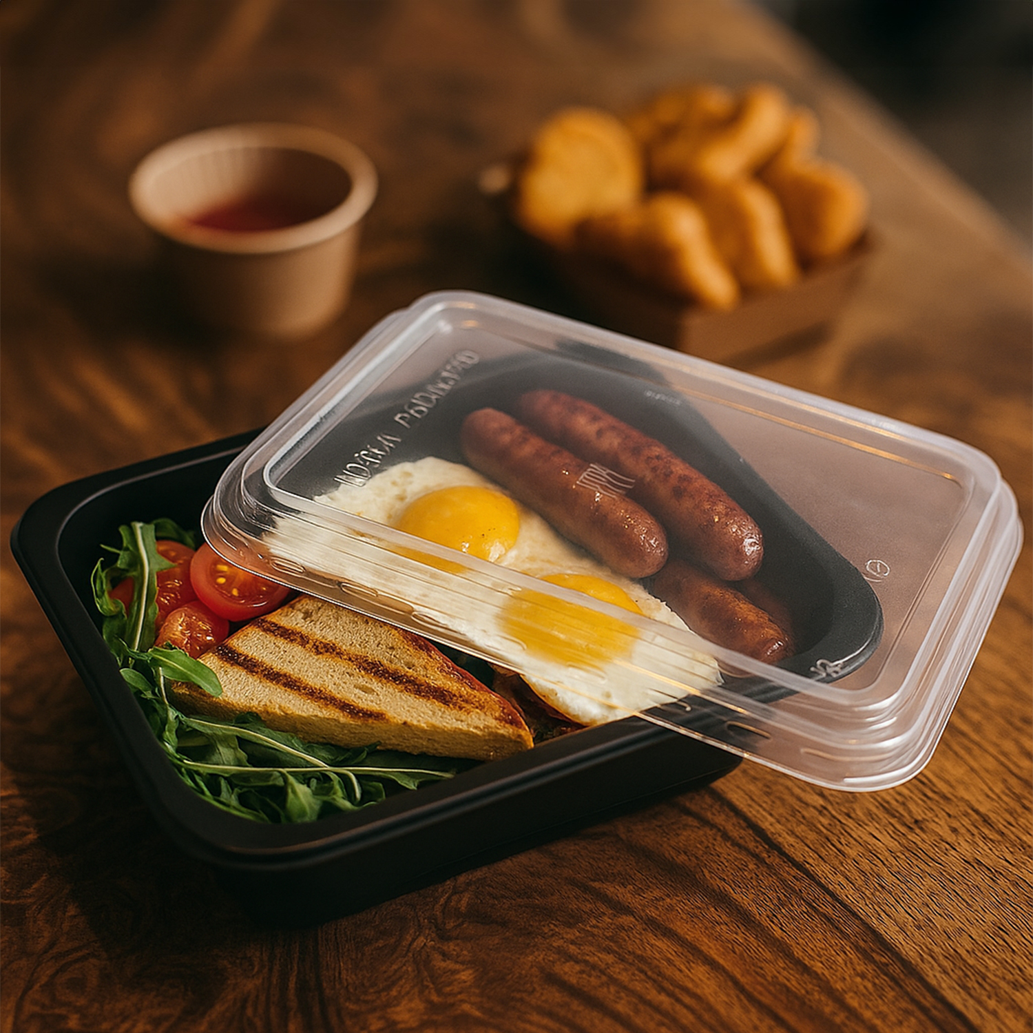 Прозора кришка для чорного контейнера 500/750 мл — це практичне рішення для герметичного закривання страв під час зберігання або транспортування. Вона щільно прилягає до контейнера, забезпечуючи надійну фіксацію без ризику протікань чи розкриття. Завдяки прозорому матеріалу вміст добре видно, що зручно під час фасування, доставки або продажу готових страв.