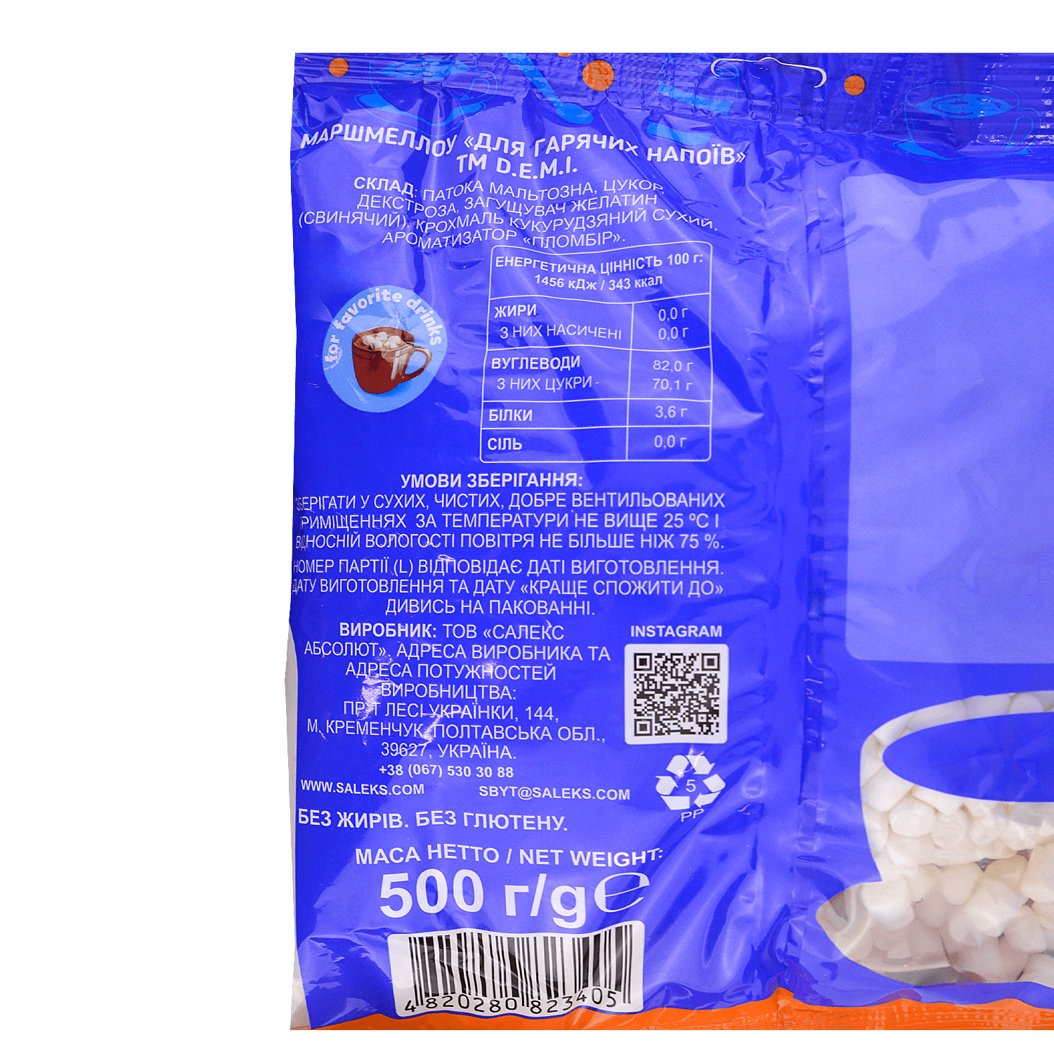 Купити недорого маршмеллоу білий D.E.M.I. 500 г можна з доставкою по всій Україні, а також переглянути, забрати чи оформити замовлення у наших шоурумах у Києві, Одесі та Рівному.
