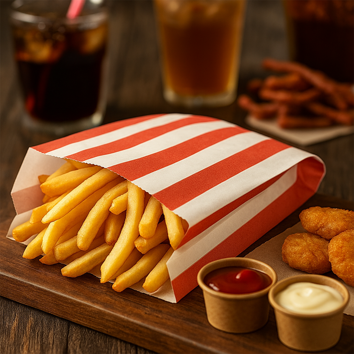 Паперові пакети – це практичне рішення для фастфуду. Вони виготовляються з жиростійкого паперу, завдяки чому не просочуються олією з картоплі фрі або іншої страви швидкого приготування і не протікають. Ви можете купити паперовий пакет Червоні смужки 160х120х50 мм не тільки для популярної страви з картоплі, але також для міні-піци, бутерброду, сендвічу, круасану, паніні і т.д. У такий пакет зручно фасувати гарячі страви та подавати їх у різних закладах, щоб клієнти не бруднили руки та могли перекусити прямо на ходу. Також у нашому асортименті є інші паперові пакети.