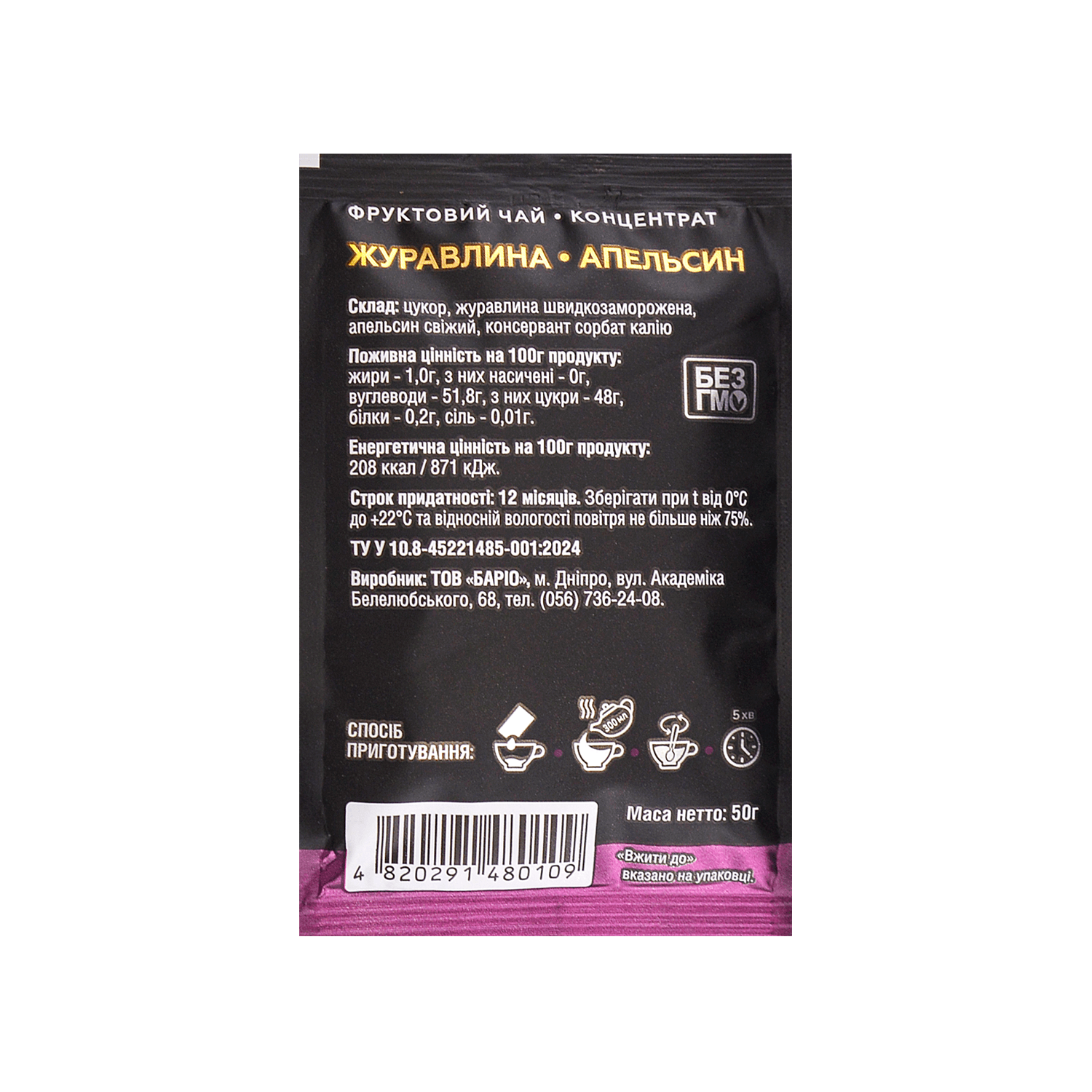 - Склад: цукор, журавлина швидкозаморожена, апельсин свіжий, консервант сорбат калію.