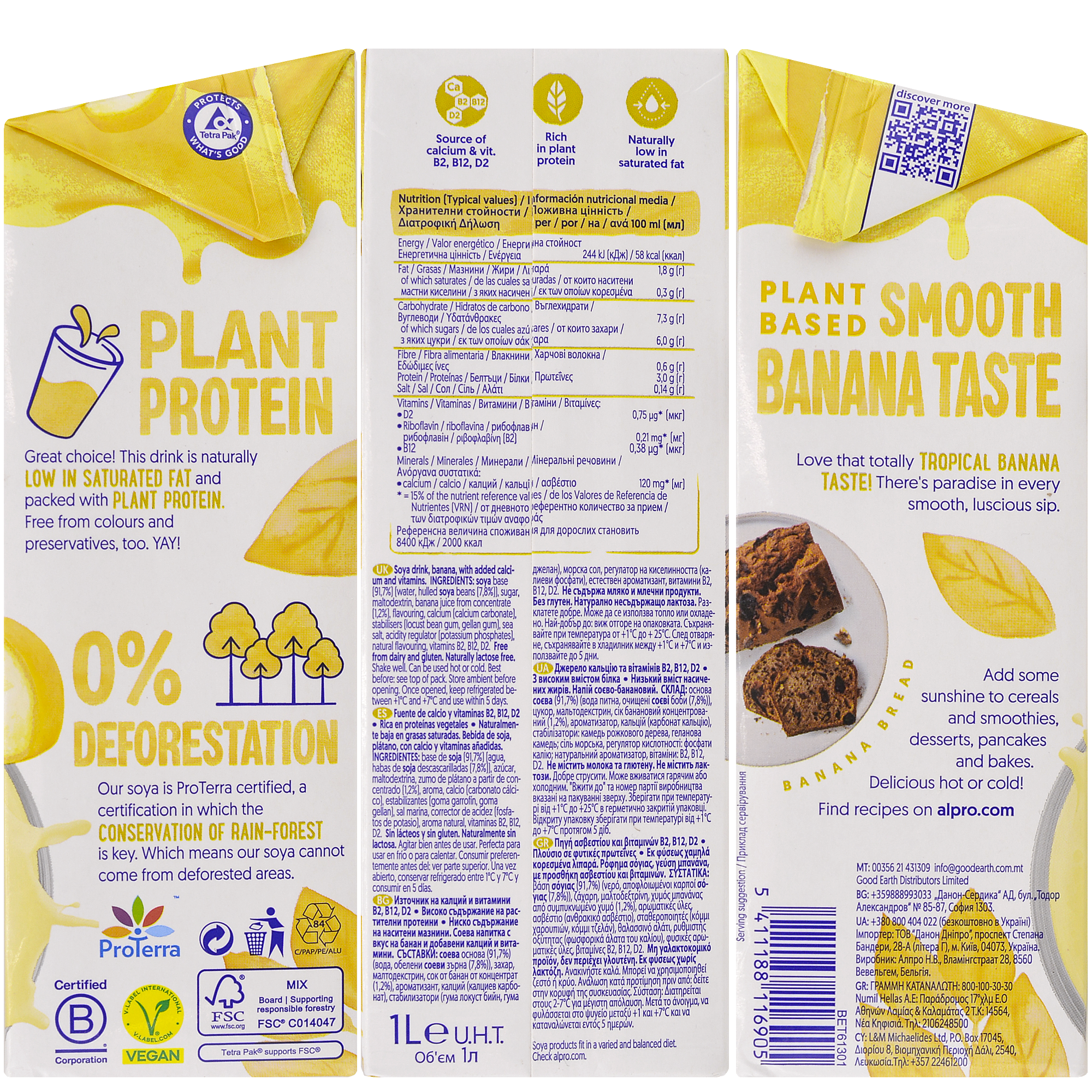 Alpro молоко рослинне Бананове 1.8% — це соєвий напій із мʼяким банановим смаком, який не містить компонентів тваринного походження. Завдяки натуральному складу та збалансованому вмісту білків і вуглеводів, воно підходить для веганського меню, а також для тих, хто уникає лактози. Молоко має приємну кремову текстуру та чудово поєднується з кавою, чаєм, мюслі або смузі.