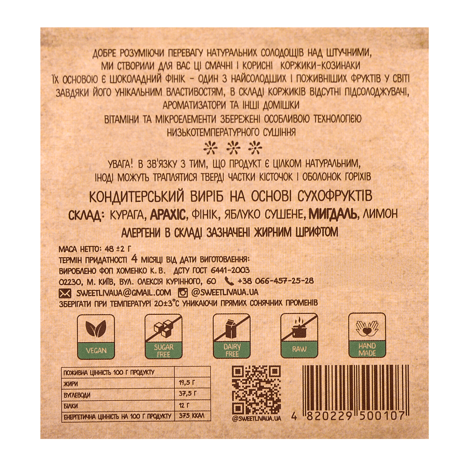 - Склад: курага, арахіс, фінік, сушене яблуко, мигдаль, лимон.