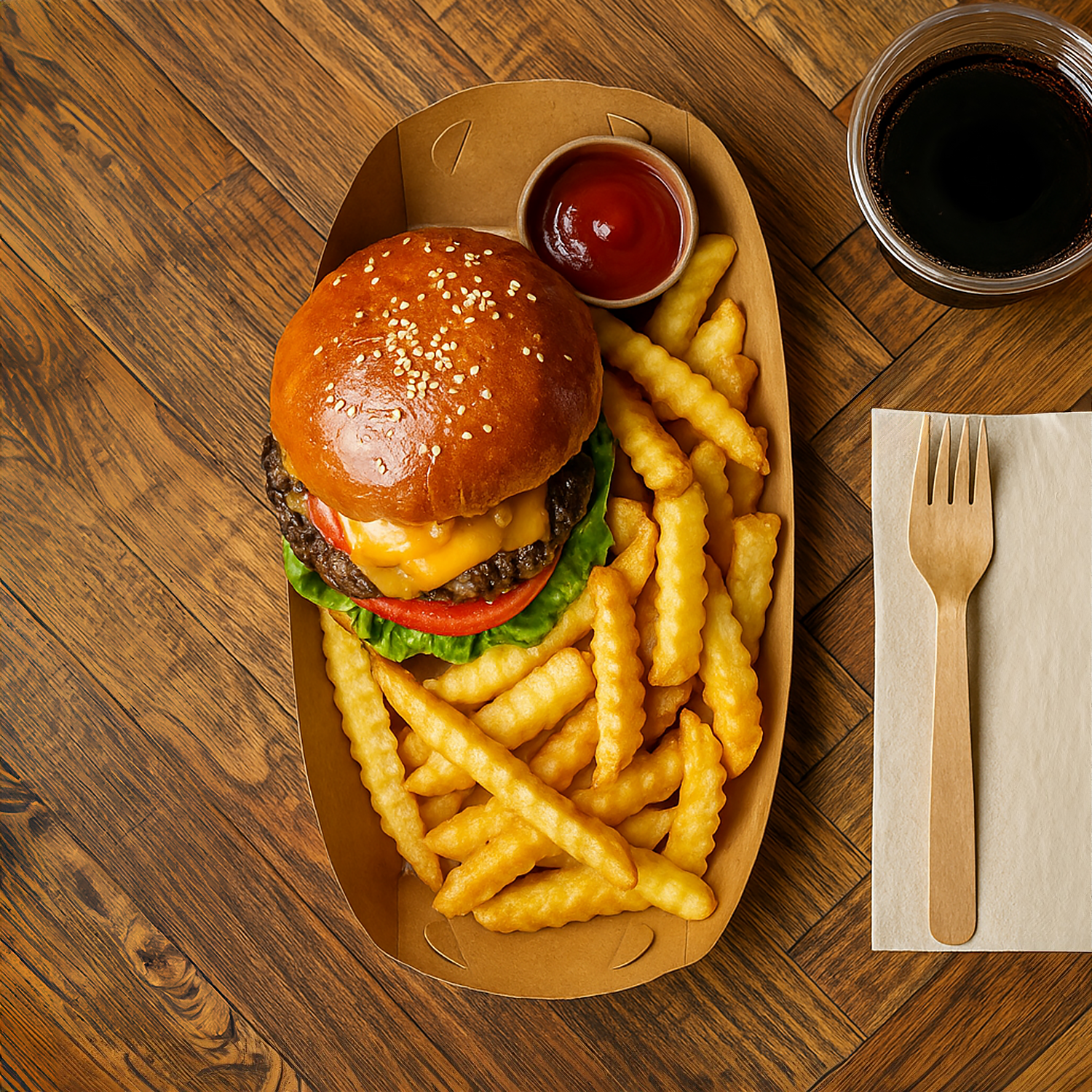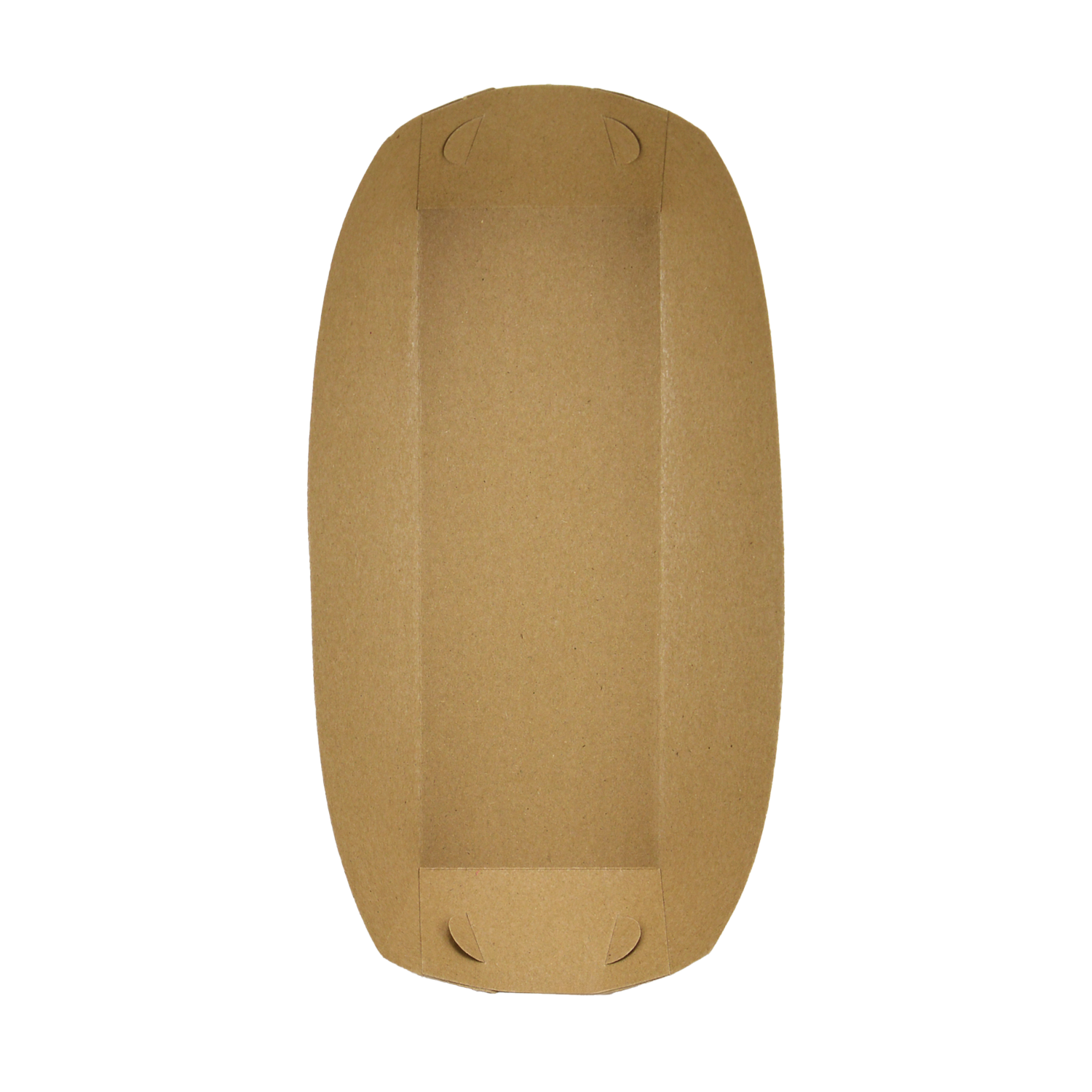 Витягнута форма та підняті краї дозволяють комфортно тримати тарілку в руках, не переживаючи за цілісність страви. Натуральний колір крафтового паперу підкреслює стиль та екологічність подачі.