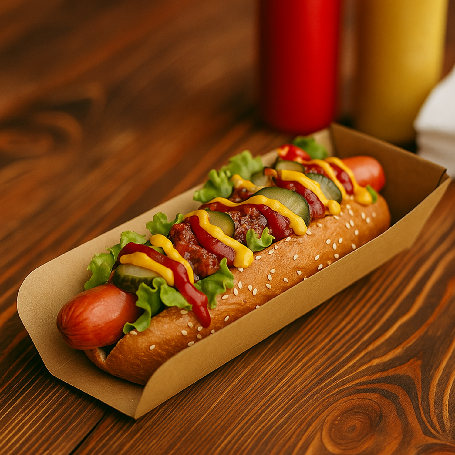 Для подачі хот-догів важливо вибирати якісну упаковку, яка буде міцною та надійною, не вбиратиме запахи, олію та інші жири і при цьому допоможе зберегти форму вашої страви. Ви можете купити упаковку для хот-догу крафт 200х40х40 мм для фастфудів, кафе, точок "вуличної їжі" і т.д. Упаковка є самозбірним відкритим човником з крафтового паперу. Вона не дозволить вашим стравам протікати і буде зручною у використанні. Також у нашому асортименті представлені інші коробки та контейнери для їжі "на винос".