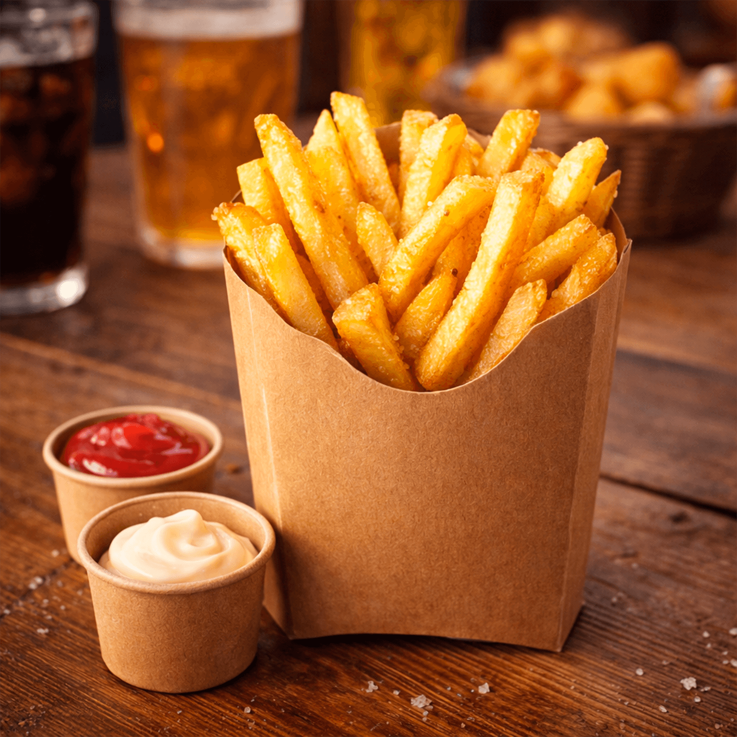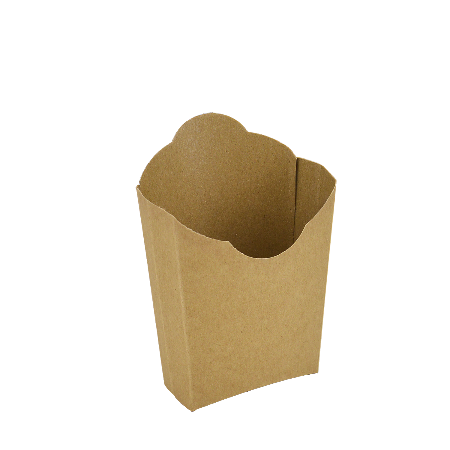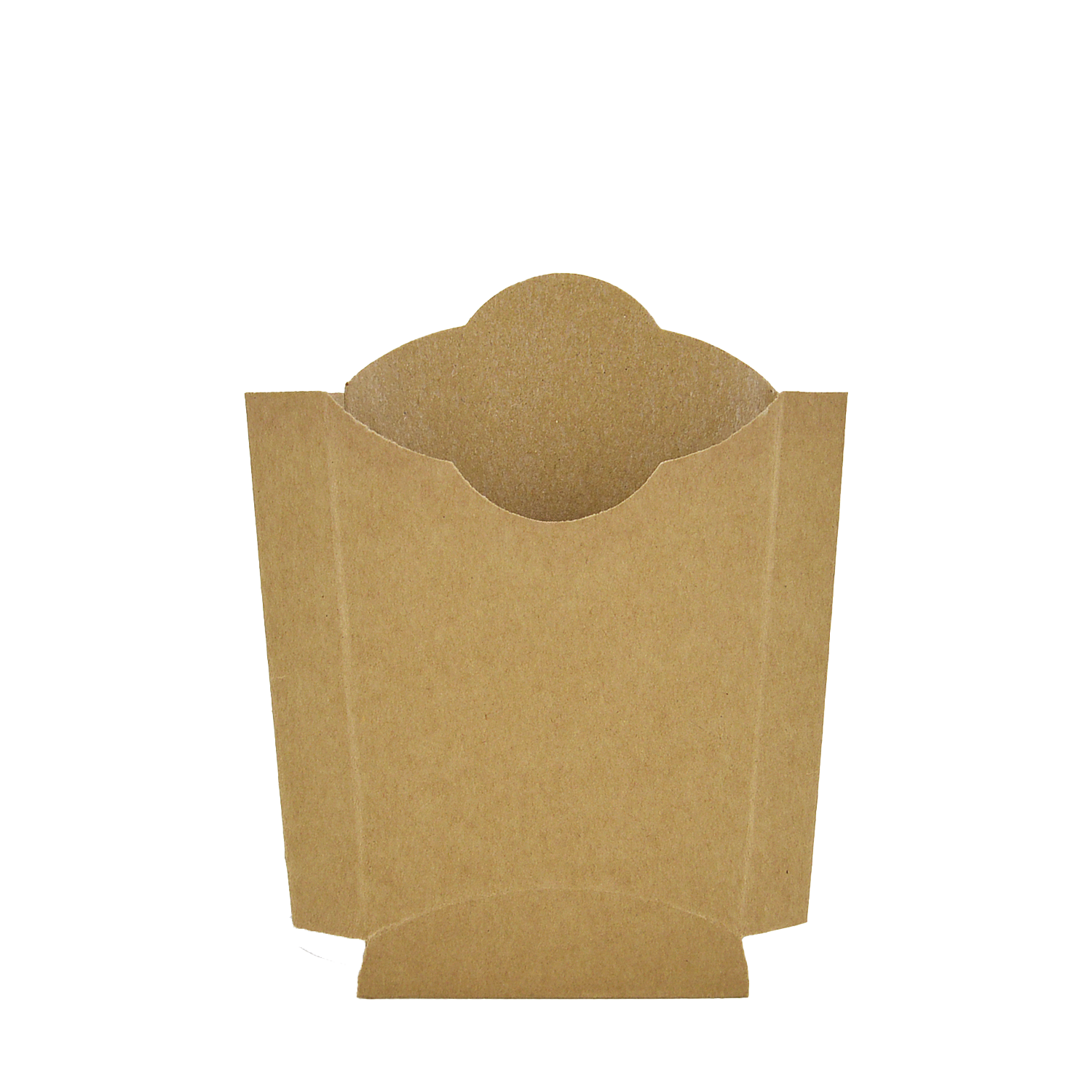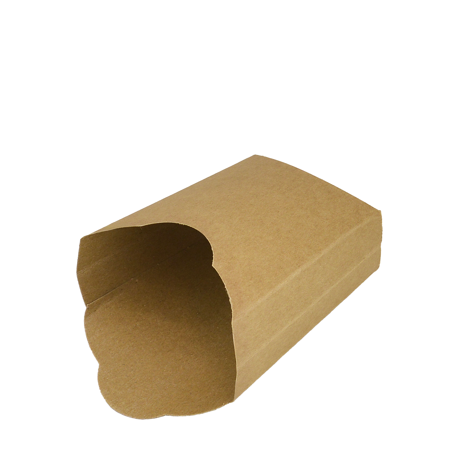 Матеріал — щільний крафтовий папір — забезпечує надійність і зручність. Упаковка не вбирає сторонніх запахів і жиру, не пропікає руки, зберігає апетитний вигляд страви. Вона ідеально підходить для невеликих порцій картоплі фрі, стрипсів, нагетсів, оніон-рингів, а також інших страв фаст-фуд меню.